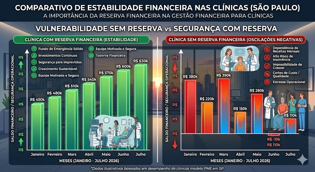 A instabilidade econômica pode afetar o fluxo de pacientes a qualquer momento. Por isso, a gestão financeira para clínicas prevê a criação de uma reserva de emergência equivalente a, pelo menos, seis meses de custos fixos da operação.